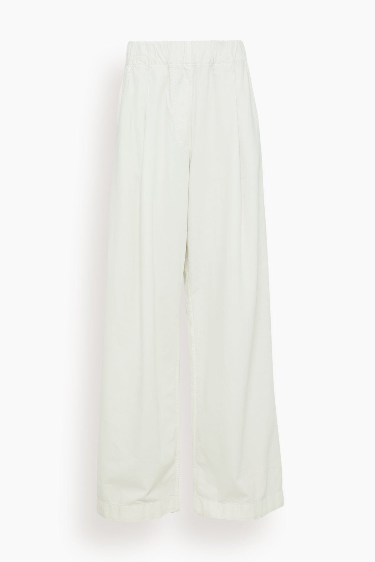 The Dries Van Noten Pila Denim Pant in Off White is a wide leg elasticated pant with pleats, in washed cotton denim. FIT DESCRIPTION MODEL MEASUREMENTS - Fits true to size, take your normal size - 100% Cotton. - Loose fit. - High rise. - Wide leg. - Pleated. - Back patch pockets and side slit pockets. - Elasticated waistband. - Harriet is wearing a size XS - Bust: 32" - Waist: 24" - Hips: 30.5" - Height: 5’8.5”