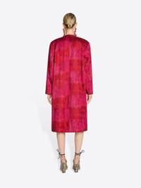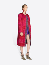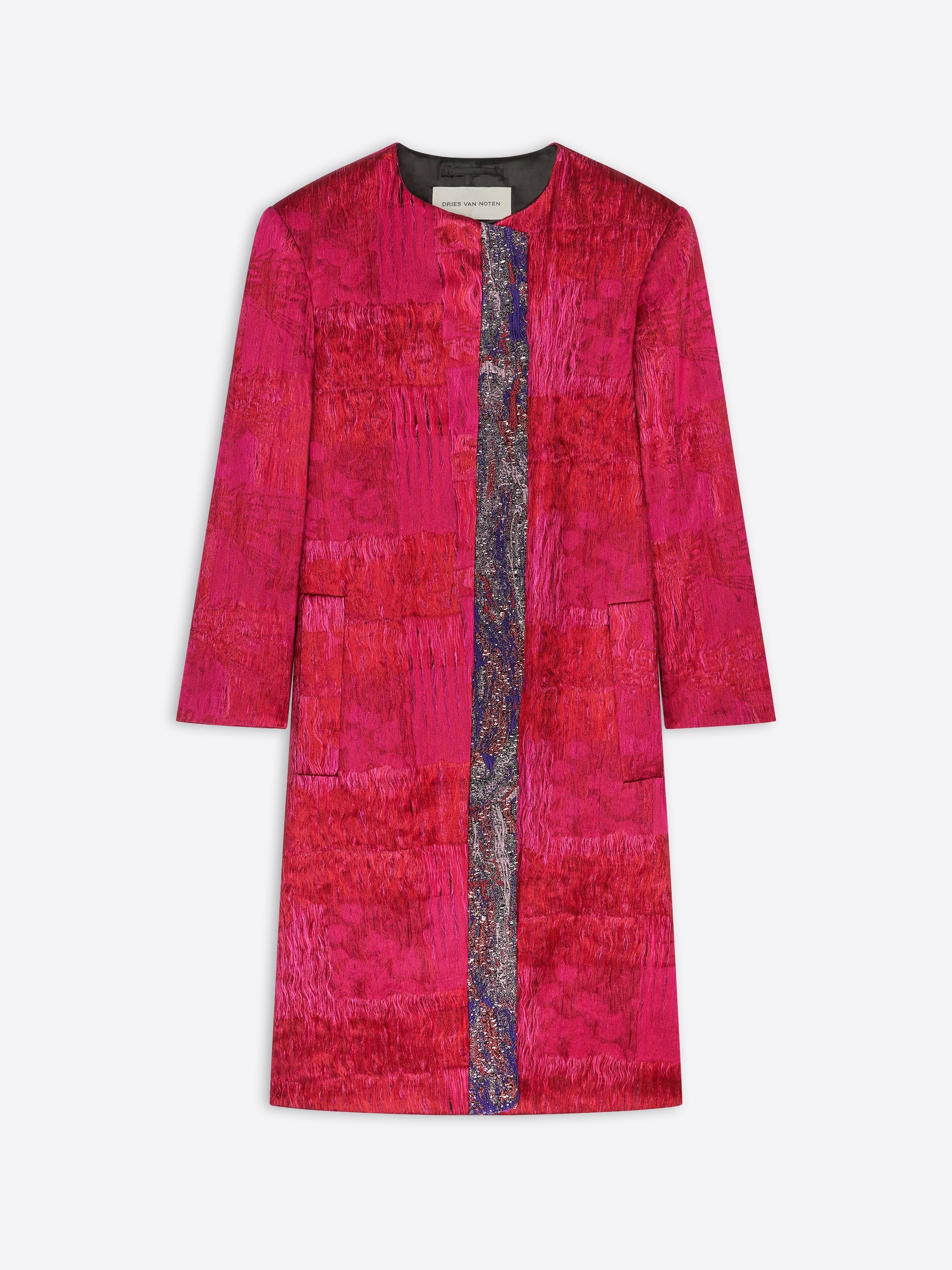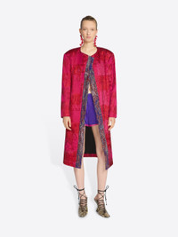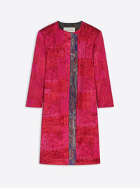 Loose fit collarless coat with contrast borders, in layered jacquard cotton acetate. DETAILS - 54% Cotton, 19% Acetate, 16% Polyester, 4% Nylon, 4% Viscose, 2% Silk, 1% Elastane. Lining: 100% Viscose. - Layered jacquard. Contrast borders. - Loose fit. Collarless. Front slit pockets. - Ref: 251-010222-1544 SIZE AND FIT Model is 179 cm / 70.5 inches and wears size M.