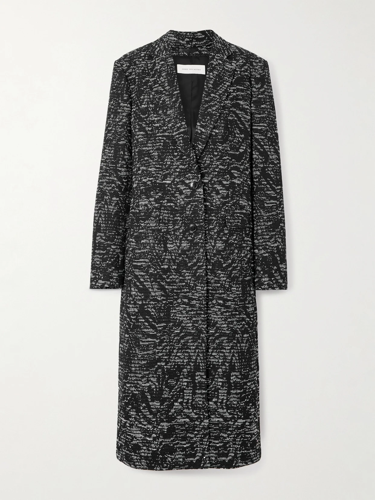 Dries Van Noten's coat is jacquard-woven with dots to create a unique pixelated effect. It's tailored in an enveloping, longline shape with notch lapels and finished with refined horn buttons. Wear yours as part of a monochrome outfit.