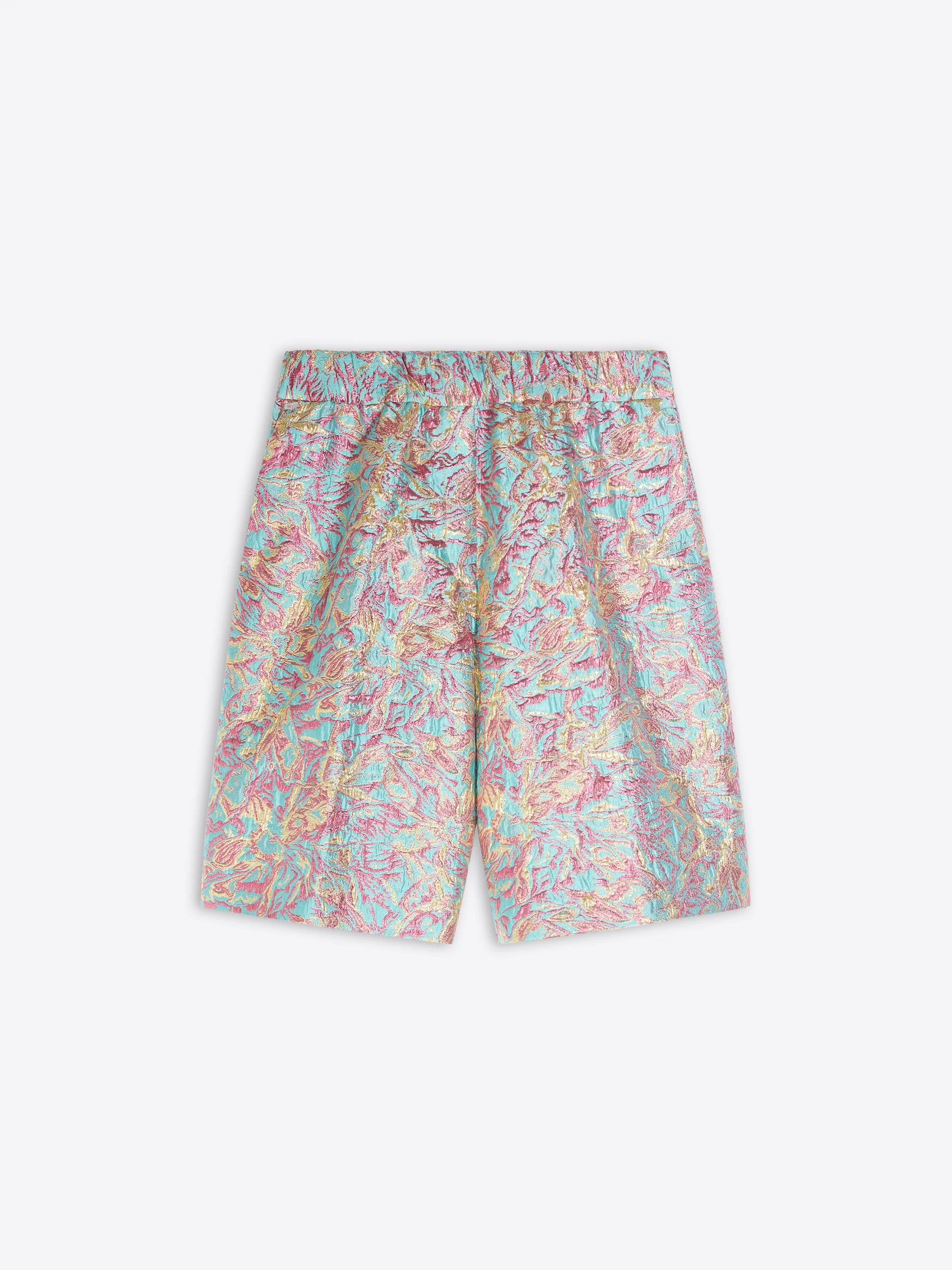 Wide leg elasticated shorts in lame floral jacquard. DETAILS - 37% Viscose, 32% Cotton, 23% Polyester, 8% Polyamide. Lining: 100% Cotton. - Lame floral jacquard. - Loose fit. Mid rise. Wide legs. Side slit pockets and back patch pocket. Elasticated waistband. - Ref: 261-010912-3153 SIZE AND FIT Model is 178 cm / 70 inches and wears size S.