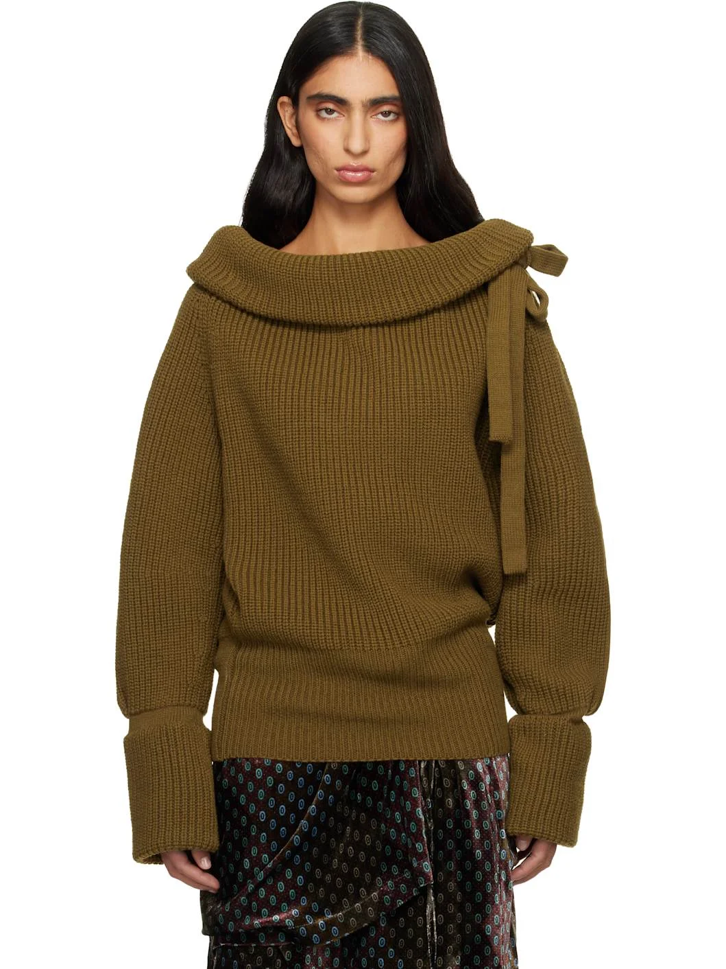 Rib-knit wool turtleneck. · Can be worn off-the-shoulder · Drawstring with self-tie fastening at collar · Raglan sleeves · Inverted box pleat at back collar Supplier color: Khaki 100% wool. Made in Belgium 252358F099012