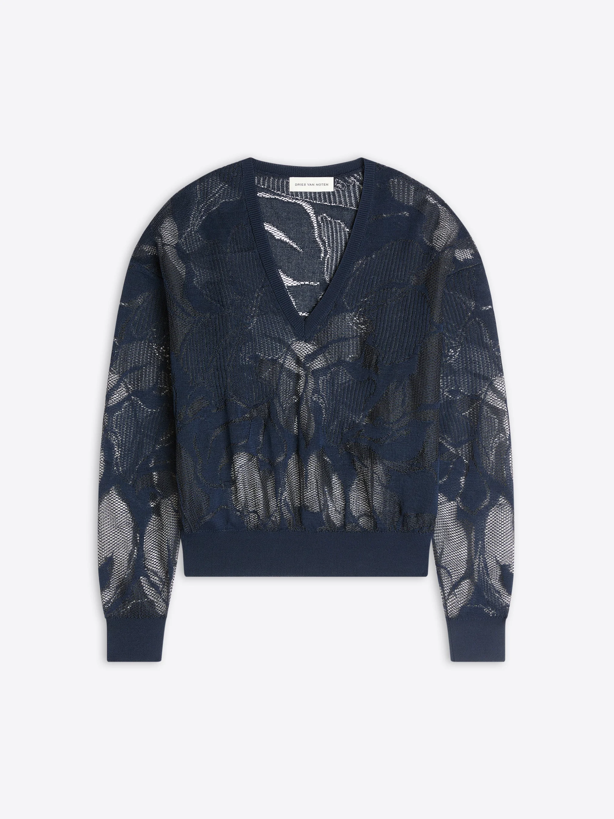 Regular fit V-neck sweater in cotton nylon blend, with lace effect. DETAILS - 88% Cotton, 12% Polyamide. - Lace effect. - Regular fit. Long sleeves. V neckline. Elasticated waistband and cuffs. - Ref: 261-011236-3733 SIZE AND FIT Model is 178 cm / 70 inches and wears size S.