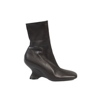 The Wedge Glove Ankle Boot in Dark Brown by Dries Van Noten is a stretch ankle boot perfect for day-to-night wear. It is made from 100% lamb leather in Italy and has a square toe, a side zip, an iconic arch heel, and a fitted glove fit. Heel height: 75. Size chart: EU. Material: 100% Calf Leather Color: Dark Brown Made in Italy Sku: WS2421389140/704