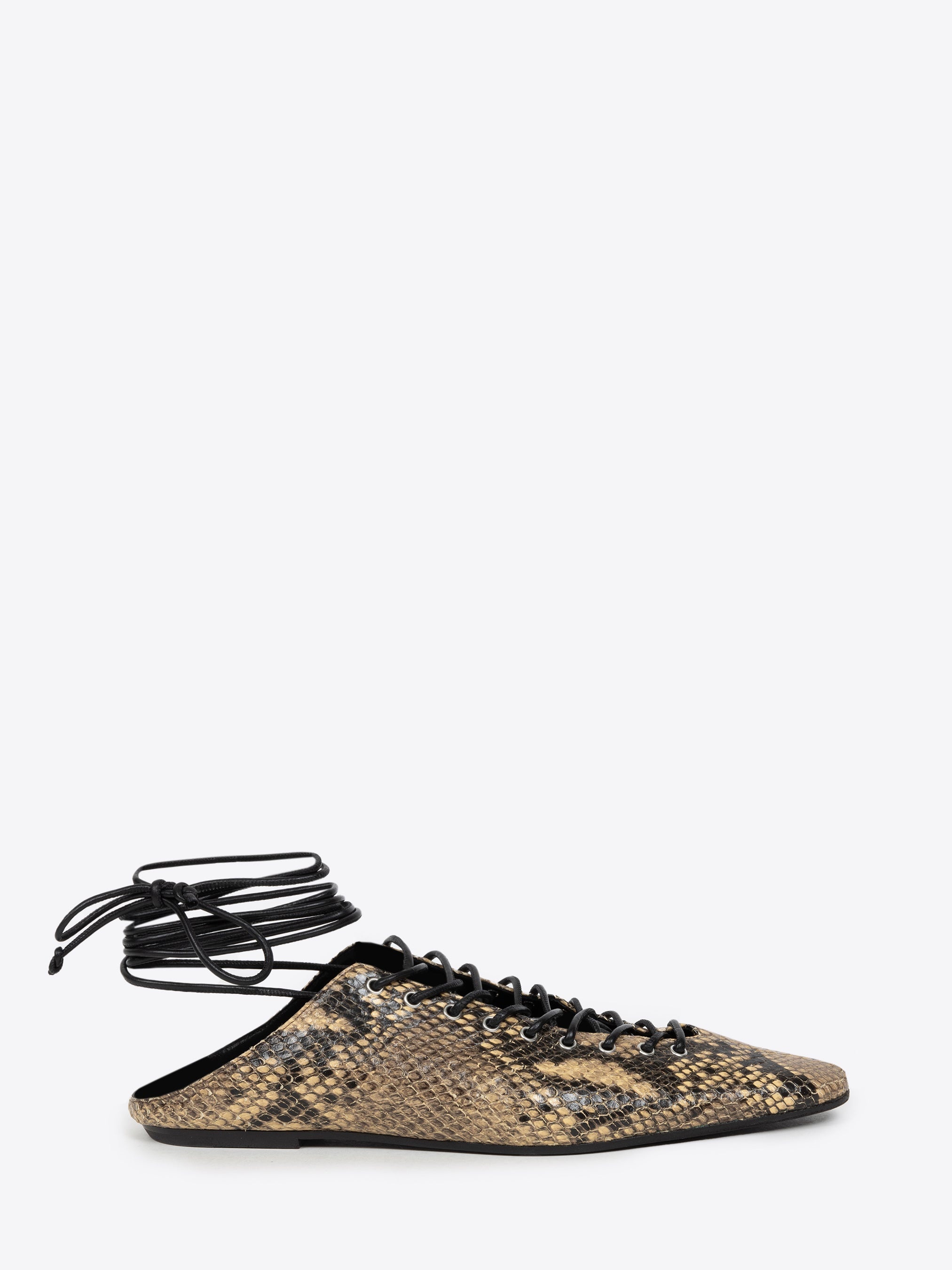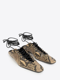 Pointed toe flats in snakeskin printed leather, with corsetry lacing. DETAILS - 100% Leather. - Snakeskin print. Corsetry lacing. - Ankle closure with leather laces. - Comes with dust bag. - Made in Italy. - Ref: 251-011739-397