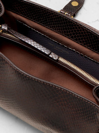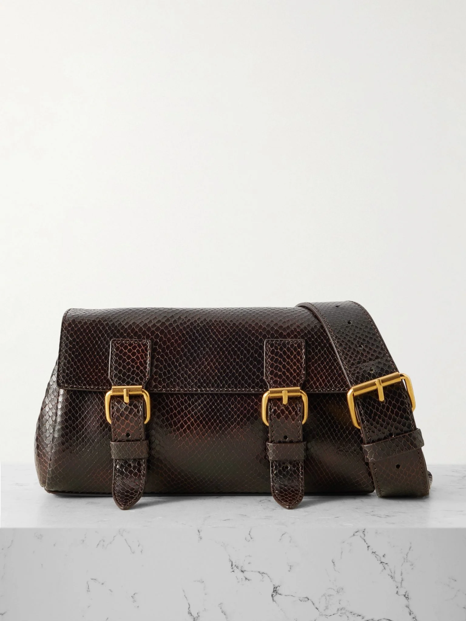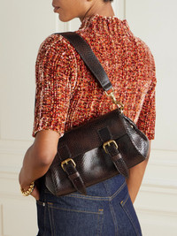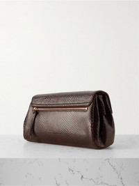 Dries Van Noten's bag is reminiscent of traditional camera styles. Crafted in Italy from snake-effect leather, it's detailed with buckle-fastening tabs and comes with a detachable shoulder strap, so you can carry it as a clutch. There's enough space inside for your phone, sunglasses and a small cosmetics pouch. Details & Care - Dark-brown snake-effect leather (Calf) - Detachable adjustable shoulder strap - External zipped pocket at back, two internal compartments, internal zipped and slip pockets - Fully lined - Magnetic fastening front flap - Comes with a dust bag