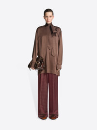 Loose fit blouse with back pussy-bow collar and pleats, in satin silk. DETAILS - 94% Silk, 6% Elastane. - Loose fit. Back pussy-bow collar and pleats. Buttoned cuffs. - Ref: 252-010779-2032 SIZE AND FIT Model is 178 cm / 70 inches and wears size M.