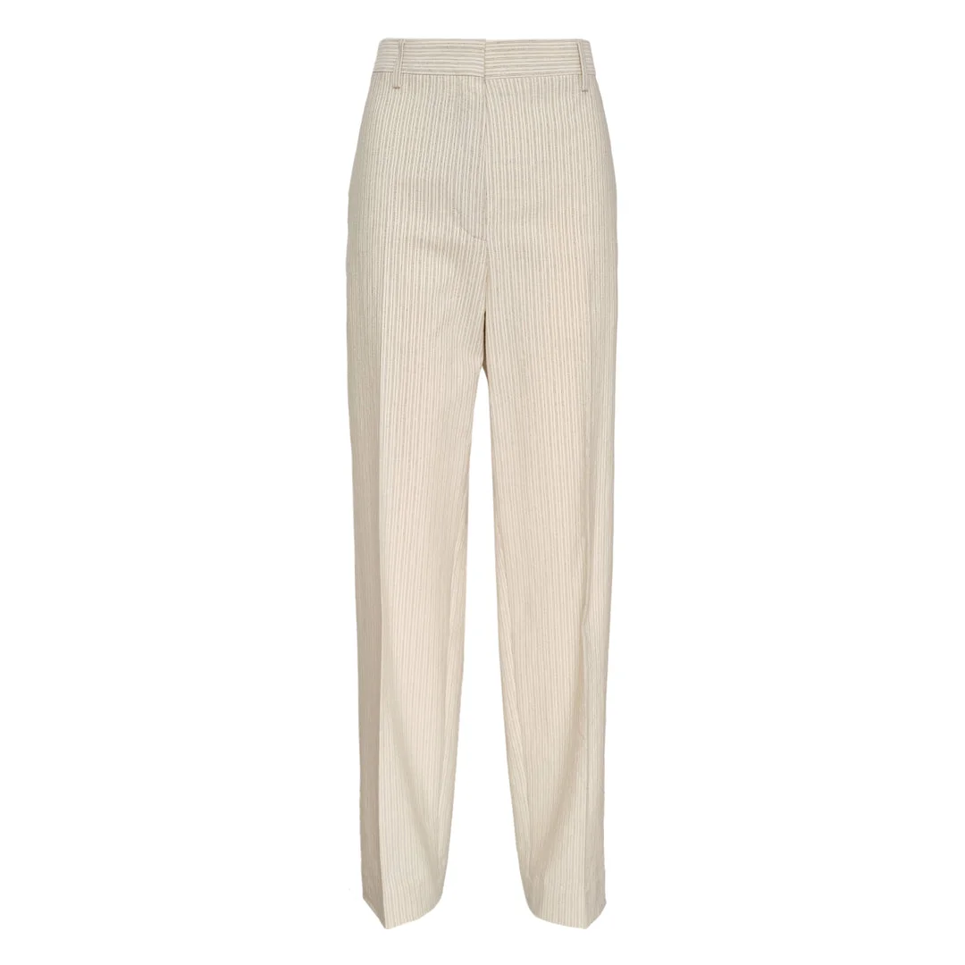 600078699OWT034 / PILAR/3360/005 - Low-rise waistband with belt loops - Tailored wide-leg silhouette - Premium pinstripe fabric construction - Flat front design - Side zip closure - Structured fit through hip and thigh - Full-length inseam Dries Van Noten Low-Waisted Tailored Wide-Leg Pants deliver sophisticated tailoring with contemporary proportions and refined construction. Crafted from premium pinstripe suiting fabric in neutral tones, featuring precise seaming and structured wide-leg silhouette. The low-rise waistline and expert tailoring create a modern interpretation of classic suiting for the contemporary wardrobe.