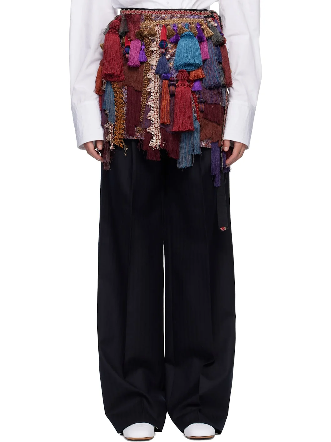 Viscose-blend brocade miniskirt. · Tassels and jacquard graphic pattern throughout · Self-tie fastening at waistband side seam · Full satin lining Supplier color: Burgundy Body: 62% viscose, 16% polyester, 14% polyamide, 8% linen. Lining: 100% viscose. Made in India 252358F090003