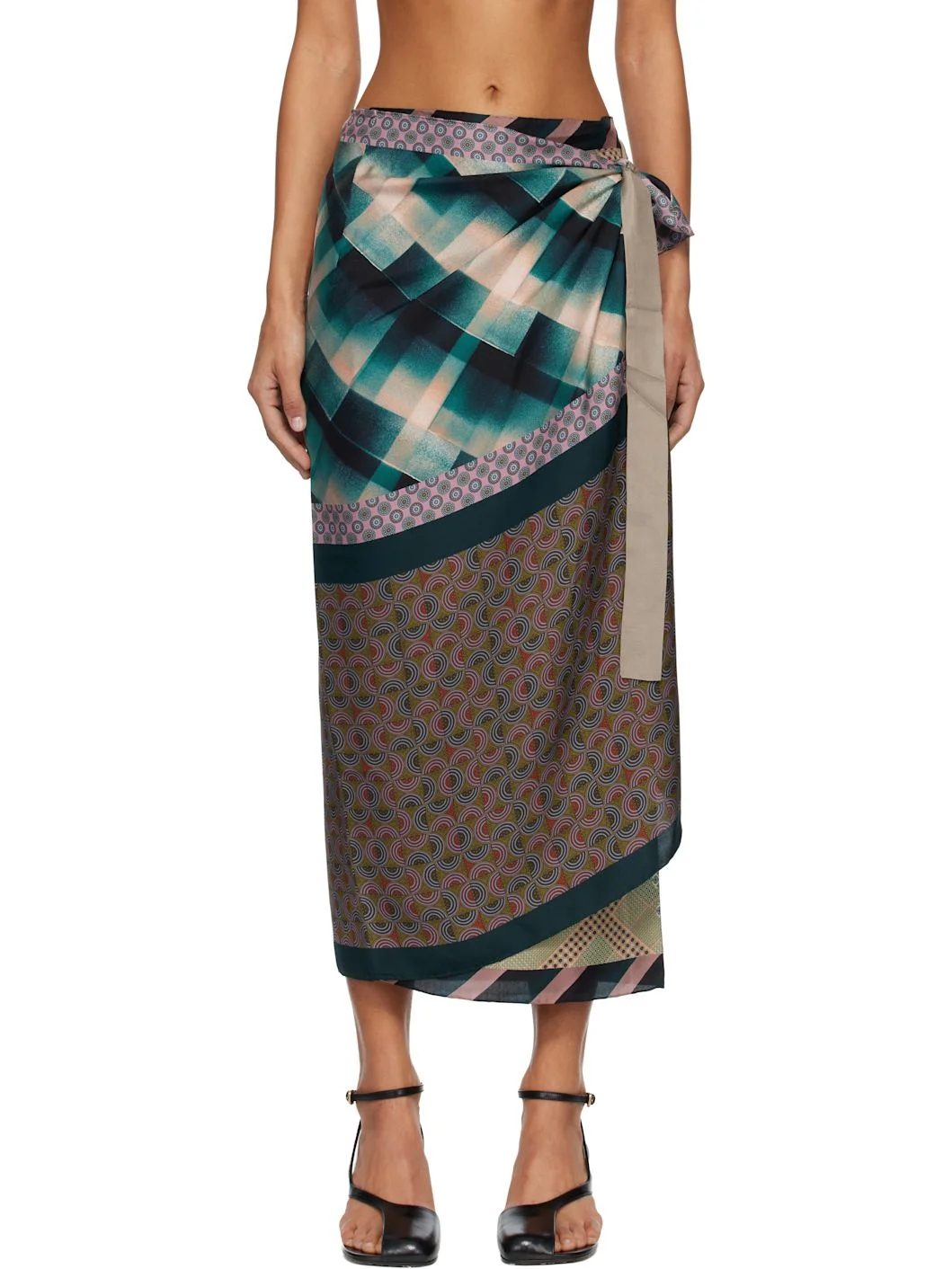Silk satin midi skirt. · Wrap construction · Graphic pattern printed throughout · Self-tie fastening at waistband · Unlined Supplier color: Dessin a 100% silk. Made in Bulgaria 252358F092021
