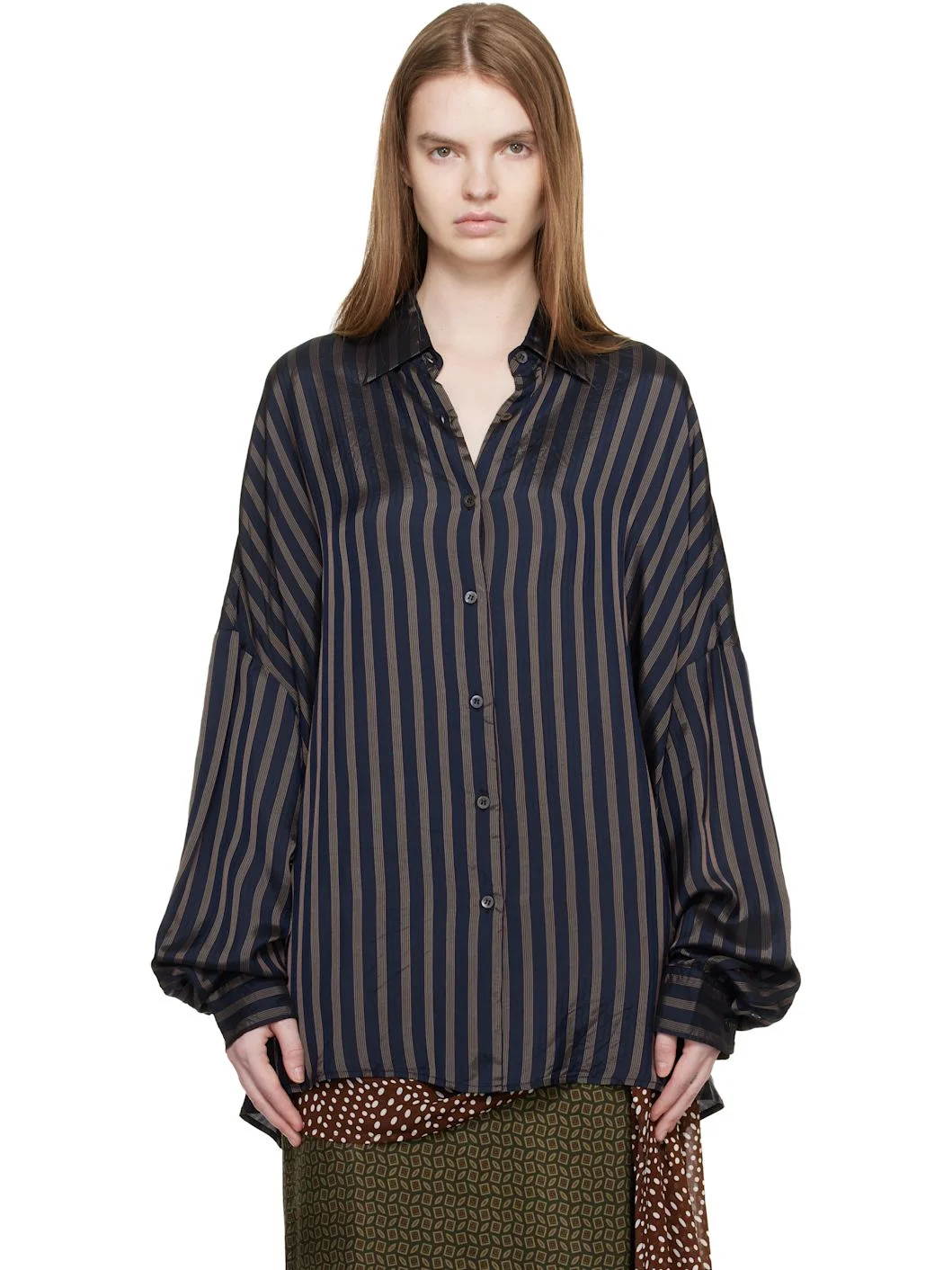 Oversized satin shirt. · Striped throughout · Spread collar · Button closure · Shirttail hem · Dropped shoulders · Barrel cuffs Supplier color: Navy 100% cupro. Made in Hungary 261358F109001