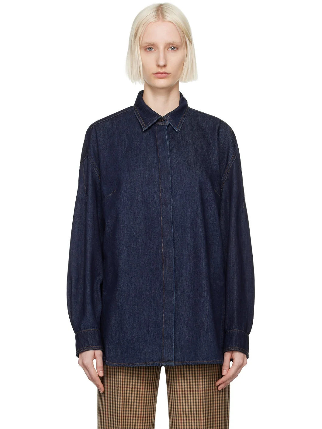 Non-stretch denim shirt. · Spread collar · Concealed button closure · Darts at side seams · Shirttail hem · Dropped shoulders · Adjustable single-button barrel cuffs · Contrast stitching in tan Supplier color: Indigo 100% cotton. Made in Tunisia 242358F109001