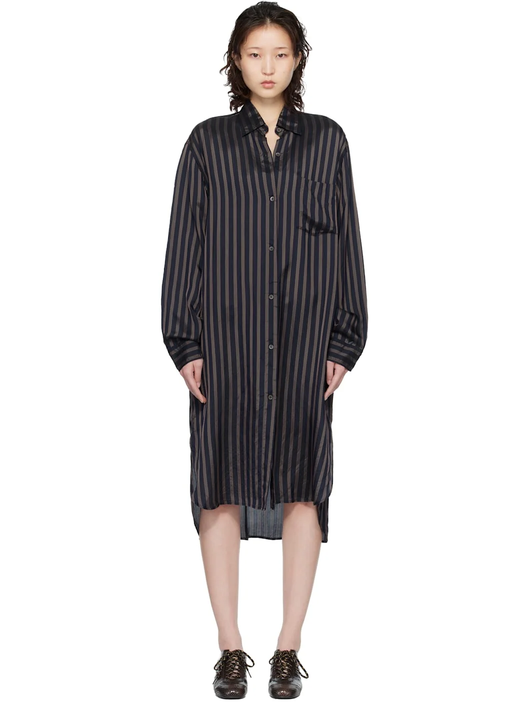 Cupro twill midi dress. · Stripes throughout · Spread collar · Button closure · Patch pocket at chest · Button vents at waist · Droptail hem · Dropped shoulders · Buttoned barrel cuffs · Box pleat at back yoke Supplier color: Navy 100% cupro. Made in Hungary 261358F054001