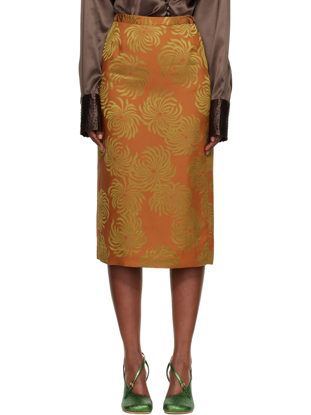Satin twill midi skirt. · Jacquard floral pattern throughout · Darts at waist · Vented back hem · Zip closure with hook eye at back waist · Full satin lining Supplier color: Orange Body: 52% acetate, 48% rayon. Lining: 100% viscose. Made in Bulgaria 252358F092035