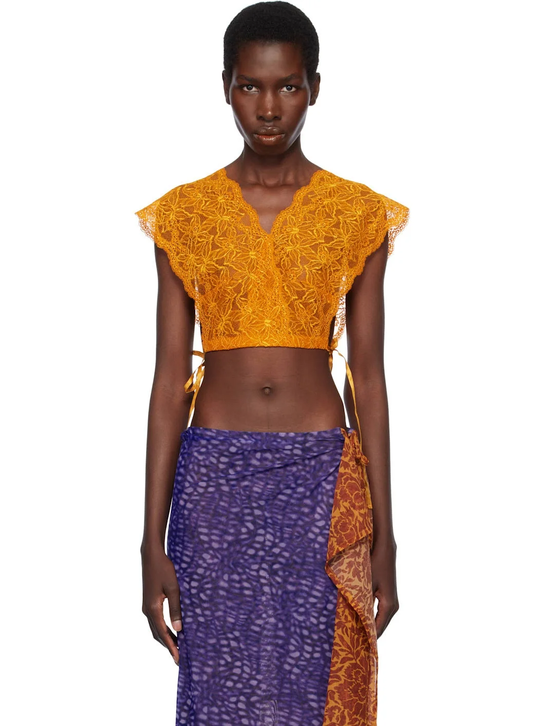 Sheer stretch nylon lace top. Scalloped edges throughout. · V-neck · Cropped hem · Self-tie fastening at sides Supplier color: Mandarin 95% polyamide, 5% elastane. Made in Poland 251358F111023