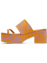 Damask slip-on heeled sandals in orange. · Jacquard floral pattern throughout · Thong-style strap at vamp · Logo patch at covered footbed · Covered block heel · Covered platform midsole · Crepe-rubber sole · Platform: H1.75" · Heel: H2.75" Supplier color: Mandarin Upper: textile. Sole: rubber. Made in Italy 251358F125013