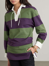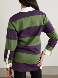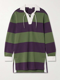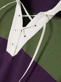 EDITORS'NOTES Dries Van Noten experiments with sports-inspired silhouettes for his Spring '24 collection. Modeled on classic rugby styles, this oversized polo shirt is made from striped cotton-blend jersey and detailed with a lace-up cream twill placket. Layer yours beneath a floor-length coat, just like it was on the runway. SIZE & FIT Model measurements: - Fits true to size, however those who are between sizes should take the smaller size - Designed for a loose fit - Mid-weight, slightly stretchy fabric - Model is 177cm/ 5'10" and is wearing a size XSmall - Bust: 81cm/ 32” - Waist: 65cm/ 25.5” - Hip: 92cm/ 36.5” DETAILS & CARE - Purple, green and cream cotton-blend jersey, cream twill - Slips on - 92% cotton, 6% linen, 2% viscose - Machine wash
