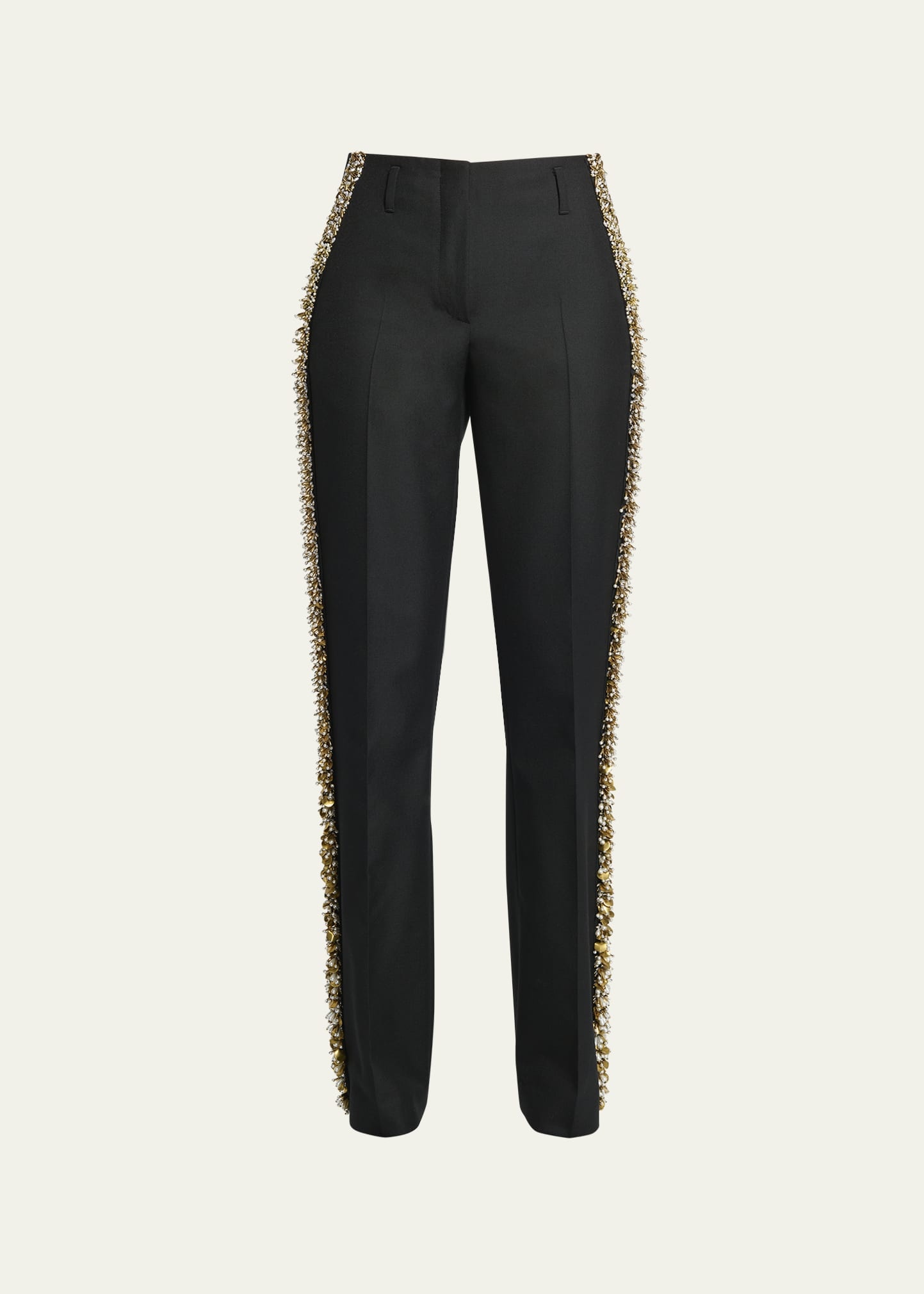 Dries Van Noten "Parchia" trousers features embellished details down the legs Mid-rise; sits high on hip Button/zip fly; belt loops Side slip pockets; back welt pockets Straight legs Full length Relaxed fit Wool Made in Morocco Model is 5'10"/177cm. Online Inquiries: BGS21_B934W| Store Inquiries: #4732373