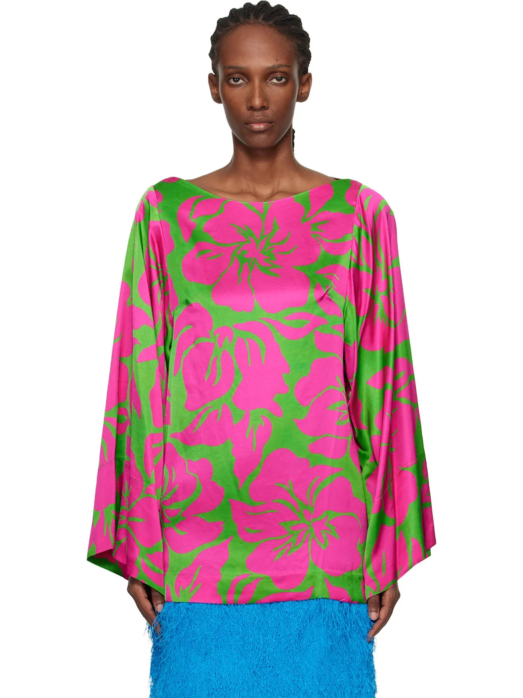 Viscose satin blouse. · Floral pattern printed throughout · Boatneck · Darts at bust Supplier color: Green 100% viscose. Made in Bulgaria 261358F107013
