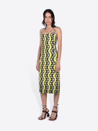 Printed fitted dress with open neckline. DETAILS - 98% Polyester, 2% Elastane. - Bicolor geometrical print. - Regular fit. Knee length. Square neckline. Back slit. Back zip closure. - Ref: 241-071066-8401 SIZE AND FIT Model is 179 cm / 70 inches and wears size 34.