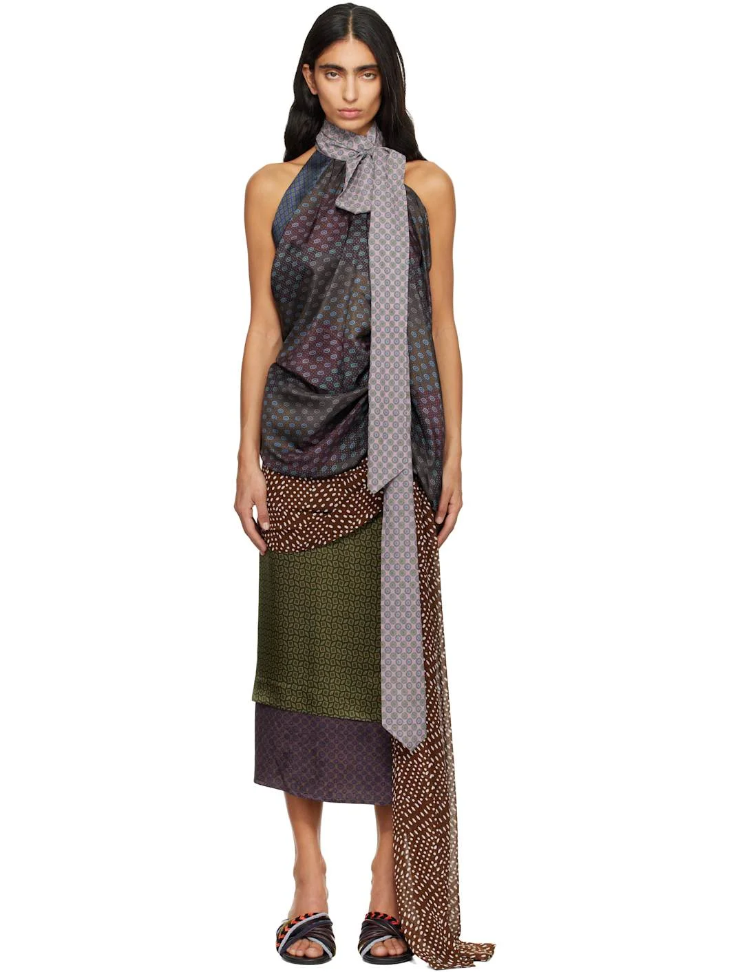 Stretch silk habotai top. · Printed graphic pattern and draping throughout · Button fastening and extended self-tie trim at halter neck · Button fastening at gathered side seam · Zip closure and gathering at low back Supplier color: Burgundy 98% silk, 2% elastane. Made in Poland 252358F111019