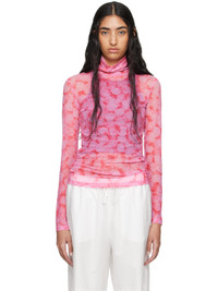 Semi-sheer stretch nylon mesh turtleneck. Pattern printed throughout. Supplier color: Pink