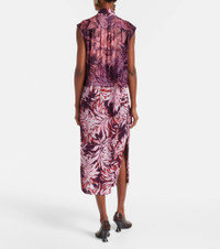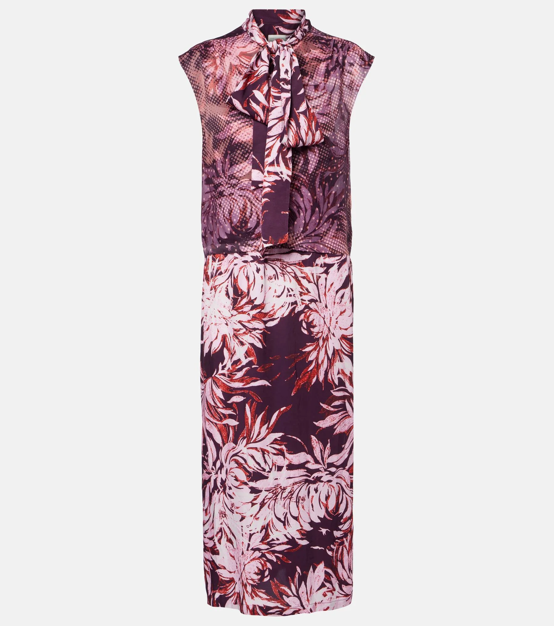 Dries Van Noten's prints are often abstract, overtly maximalist, and always one-of-a-kind. Complete with a sheer overlay on its bodice, this tie-neck midi dress features a modern nature-inspired print. Product Details - Material: 73% viscose, 27% silk - Care instructions: dry clean - Made in Poland - Designer color name: Burgundy - Item color: burgundy - Closure: half-buttoned front - Side slits - Self-tie collar - Item number: P01106655 Size & Fit - True to size - Designed for a loose fit - Non-stretchy fabric - The model seen in the picture is 178cm-5'10" and wearing a size FR 36