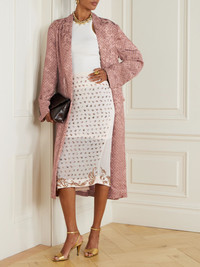 Dries Van Noten has long made color and pattern his signature language, using them to turn his clothes into visual masterpieces. This coat is made from wool that's jacquard-woven with an intricate geometric motif borrowed from traditional ties. It has drawstrings at the waist to cinch in the loose fit and secure it closed. Size & Fit - Fits true to size, take your normal size - Designed for a loose fit, use the adjustable drawstring to cinch in at the waist - Lightweight, fluid, non-stretchy fabric - Model is 177cm/ 5'10" and is wearing a FR 36 Model measurements: - Bust: 86cm/ 34" - Waist: 65cm/ 25.5" - Hip: 90cm/ 35.5" Details & Care - Peach wool-jacquard - Ties at front - 100% wool - Dry clean