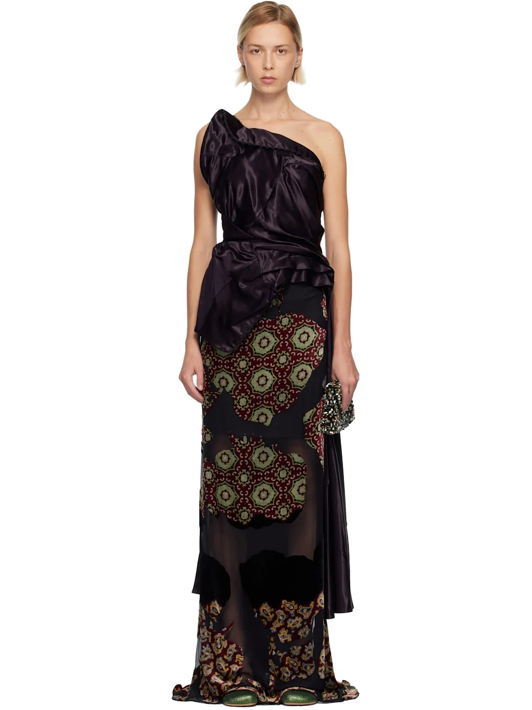 Viscose satin top. · Draped and single-shoulder construction · Loops at collar · Asymmetrical hem · Extended trim at hem side seam · Fixed shoulder strap · Fully lined Supplier color: Dark purple Body: 100% viscose. Lining: 100% viscose. Made in Poland 252358F111013