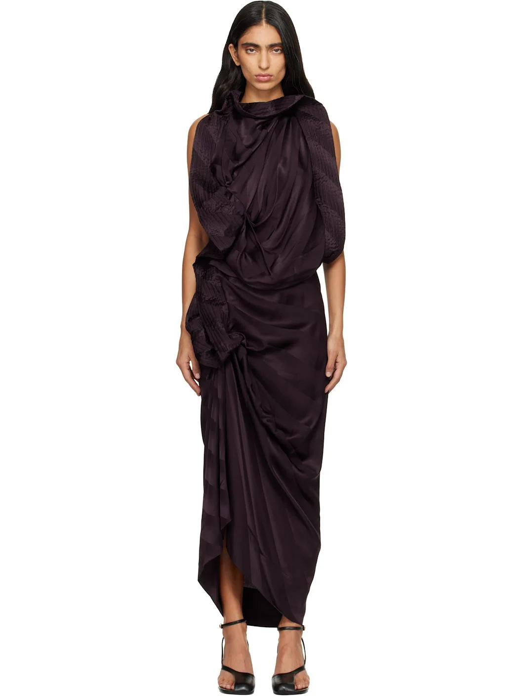 Silk satin maxi dress. · Asymmetrical construction · Stripes, draping, and quilted trim throughout · Self-tie halter neck fastening · Concealed zip closure at side seam · Low back Supplier color: Dark purple 100% silk. Made in Poland 252358F055005