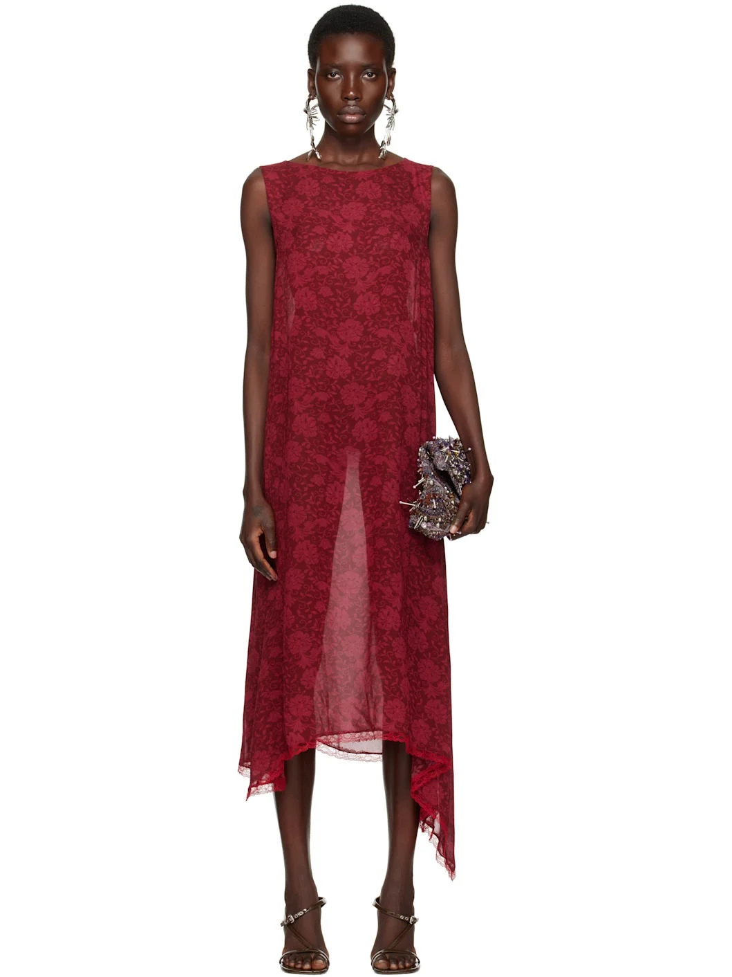 Viscose crepe midi dress. Floral pattern printed throughout. · Semi-sheer · Boatneck · Vented side seam · Lace trim at asymmetric hem Supplier color: Cherry Body: 100% viscose. Trim: 50% polyamide, 45% viscose, 5% cotton. Made in Portugal 251358F054009