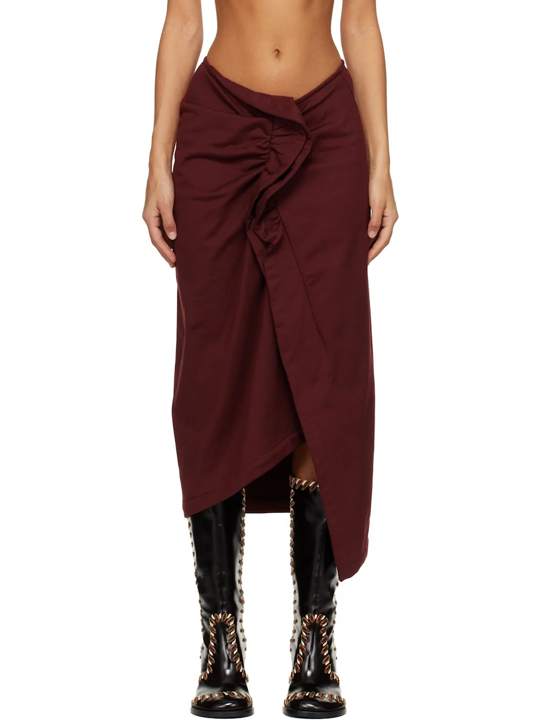 Heavyweight French terry midi skirt. · Ruffle and draping at front · Slit at asymmetric hem · Zip closure at side seam Supplier color: Ruby 100% cotton. Made in Turkey 252358F092014