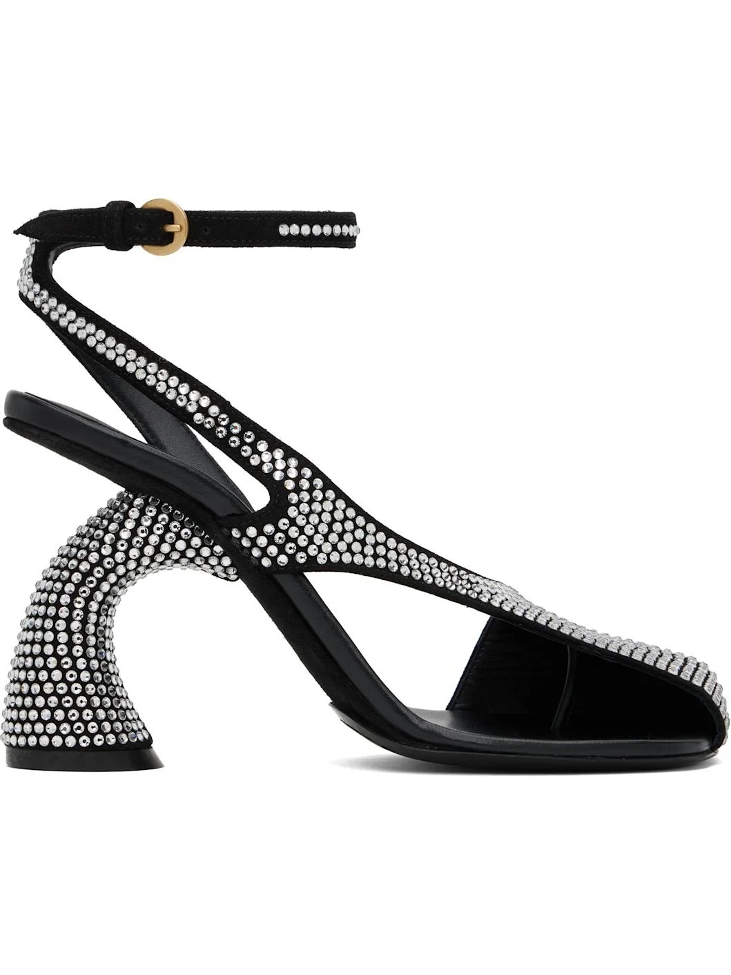 Suede heeled sandals in black. · Crystal-cut detailing throughout · Open square toe · Concealed thong-style strap at vamp · Pin-buckle ankle strap · Buffed leather lining · Modified comma heel with rubber injection · Leather sole · Heel: H3.5" Supplier color: Black Upper: leather. Sole: leather, rubber. Made in Italy 242358F125011
