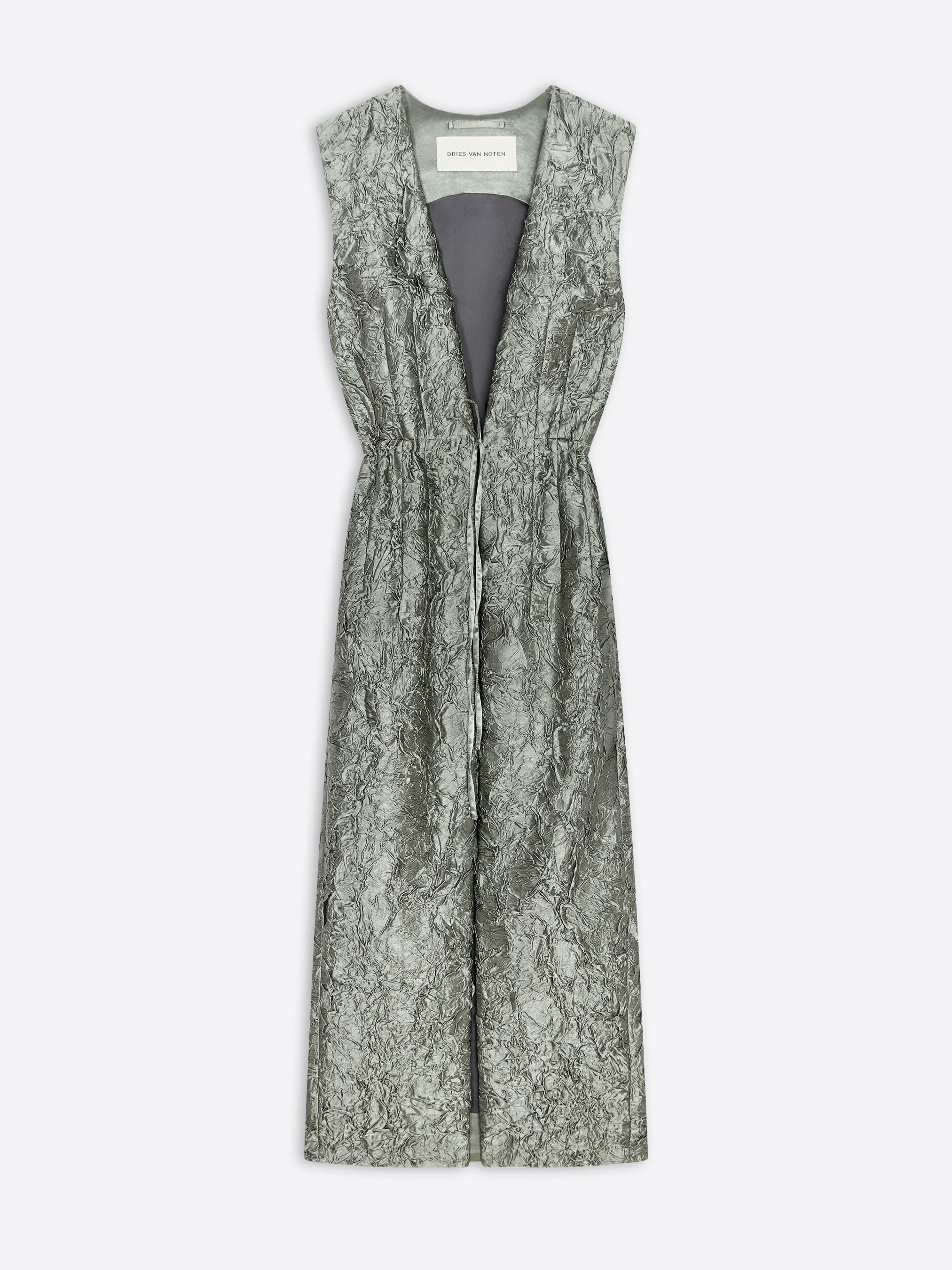 Long sleeveless coat with drawstring closure, in plisse crushed viscose cotton blend. DETAILS - 62% Viscose, 38% Cotton. Lining: 100% Viscose. - Fitted. Knee length. Sleeveless. Side slit pockets. Drawstring waistband. - Ref: 251-010227-1428 SIZE AND FIT Model is 179 cm / 70.5 inches and wears size 34.
