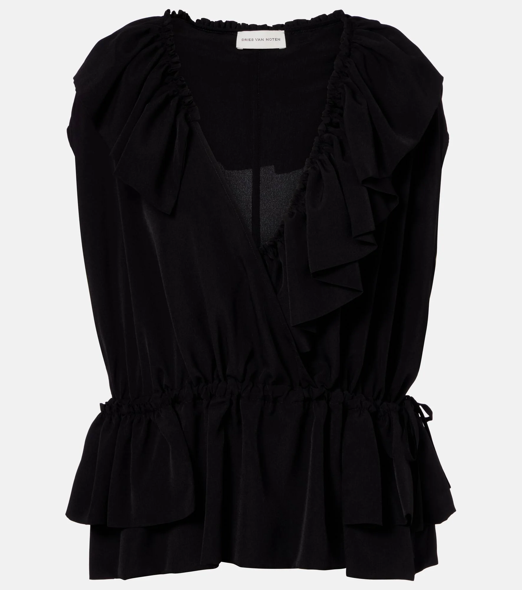 Exude elegance in this top from Dries Van Noten. The design is crafted from jersey with a self-tie, gathered waist, and ruffles along the neckline. Product Details - Material: 100% polyester - Care instructions: machine wash at 30 degrees - Made in Bulgaria - Color: black - Designer color name: Black - Self-tie waist - Item number: P01151839 Size & Fit - Fits large to size - we recommend trying one size smaller - Non-stretchy fabric - Falls to the hip - The model seen in the picture is 178cm-5'10" and wearing a size FR 34