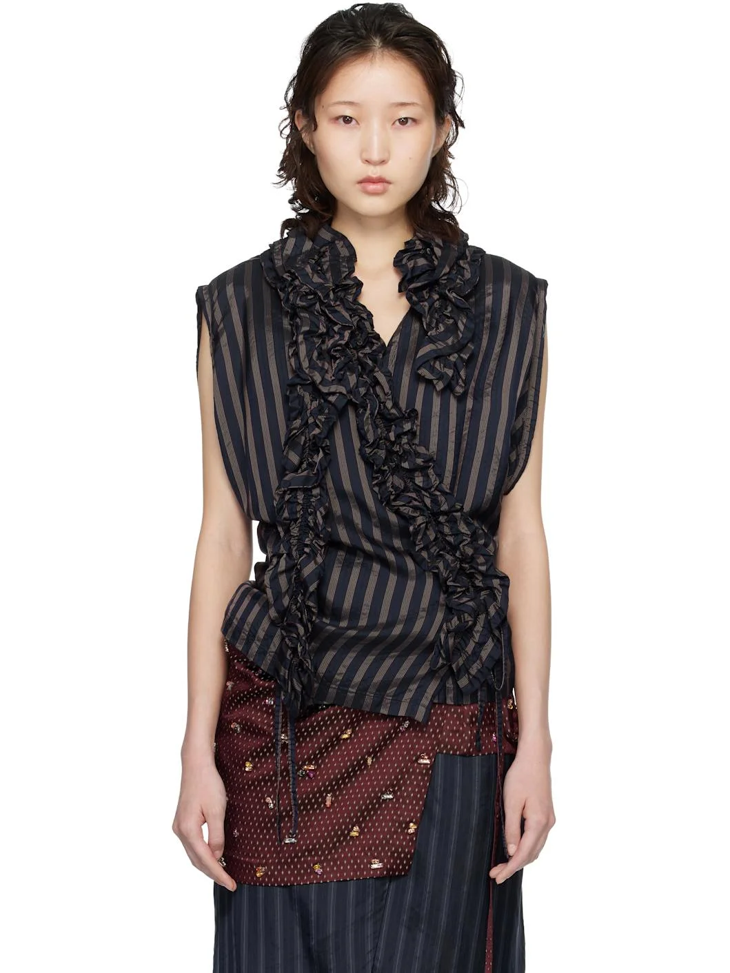 Cupro twill top. · Stripes throughout · Wrap construction · Ruffled trim at V-neck · Self-tie fastening at waist Supplier color: Navy 100% cupro. Made in Bulgaria 261358F111003
