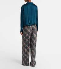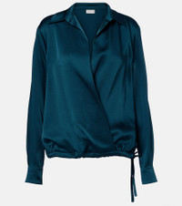 Crafted from satin, this top from Dries Van Noten features a charming wrapped design. The relaxed-fit silhouette is complete with a classic collar and adjustable drawstring hem for a customizable fit. Product Details - Material: 73% acetate, 27% viscose - Care instructions: dry clean - Made in Hungary - Designer color name: Petrol - Item color: blue - Collar: one-piece - Cuff: buttoned - Drawstring waist - Item number: P01092131 Size & Fit - True to size - Designed for a loose fit - Adjustable hem - Non-stretchy fabric - Slightly cropped - The model seen in the picture is 178cm-5'10" and wearing a size FR 36