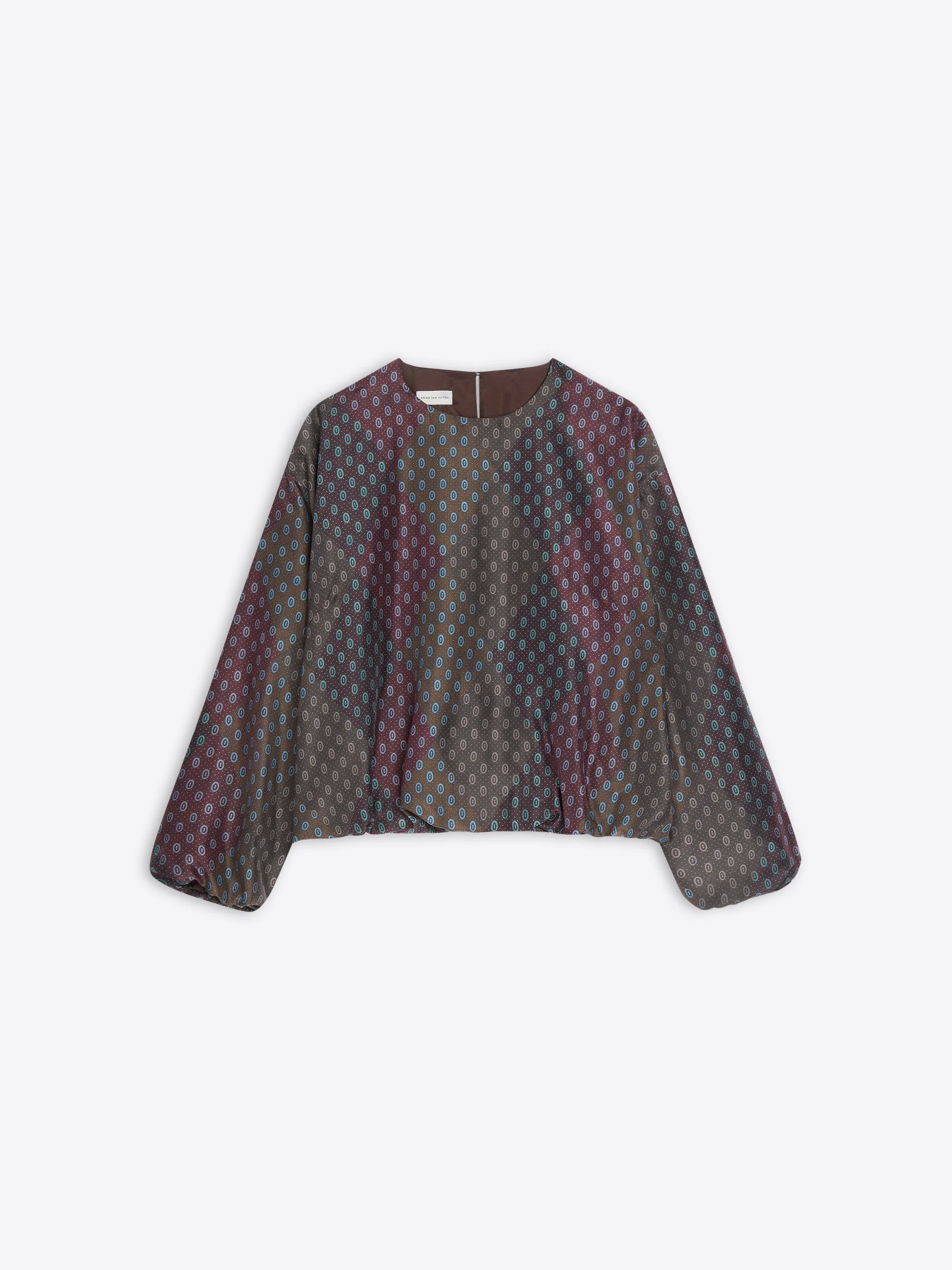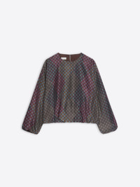 Loose fit cocoon top in silk habotai, with Tie print and Argyle pattern. DETAILS - 100% Silk. Lining: 100% Silk. - Tie print with Argyle pattern. - Loose fit. Lined. Long sleeves. Elasticated sleeves and waistband. Round collar. Back single button closure. - Ref: 252-010772-2127 SIZE AND FIT Model is 178 cm / 70 inches and wears size 36.