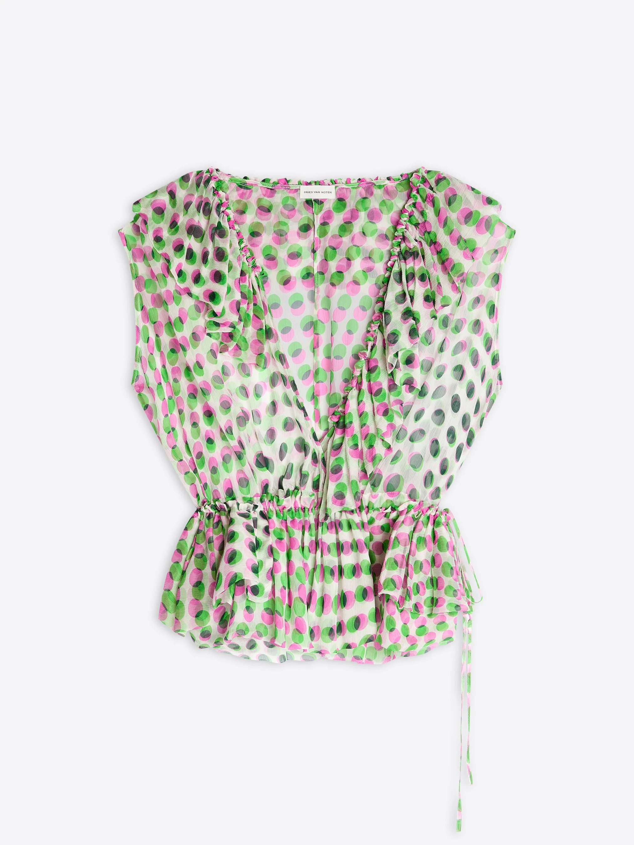 Fitted open top with gathered waist and asymmetrical ruffles, in silk creponne with Layered Optical Polka Dot print. DETAILS - 100% Silk. - Layered Optical Polka Dot print. - Ruffle detail. - Regular fit. Sleeveless. V neckline. Waist tie closure. - Ref: 261-010710-3094 SIZE AND FIT Model is 178 cm / 70 inches and wears size 36.