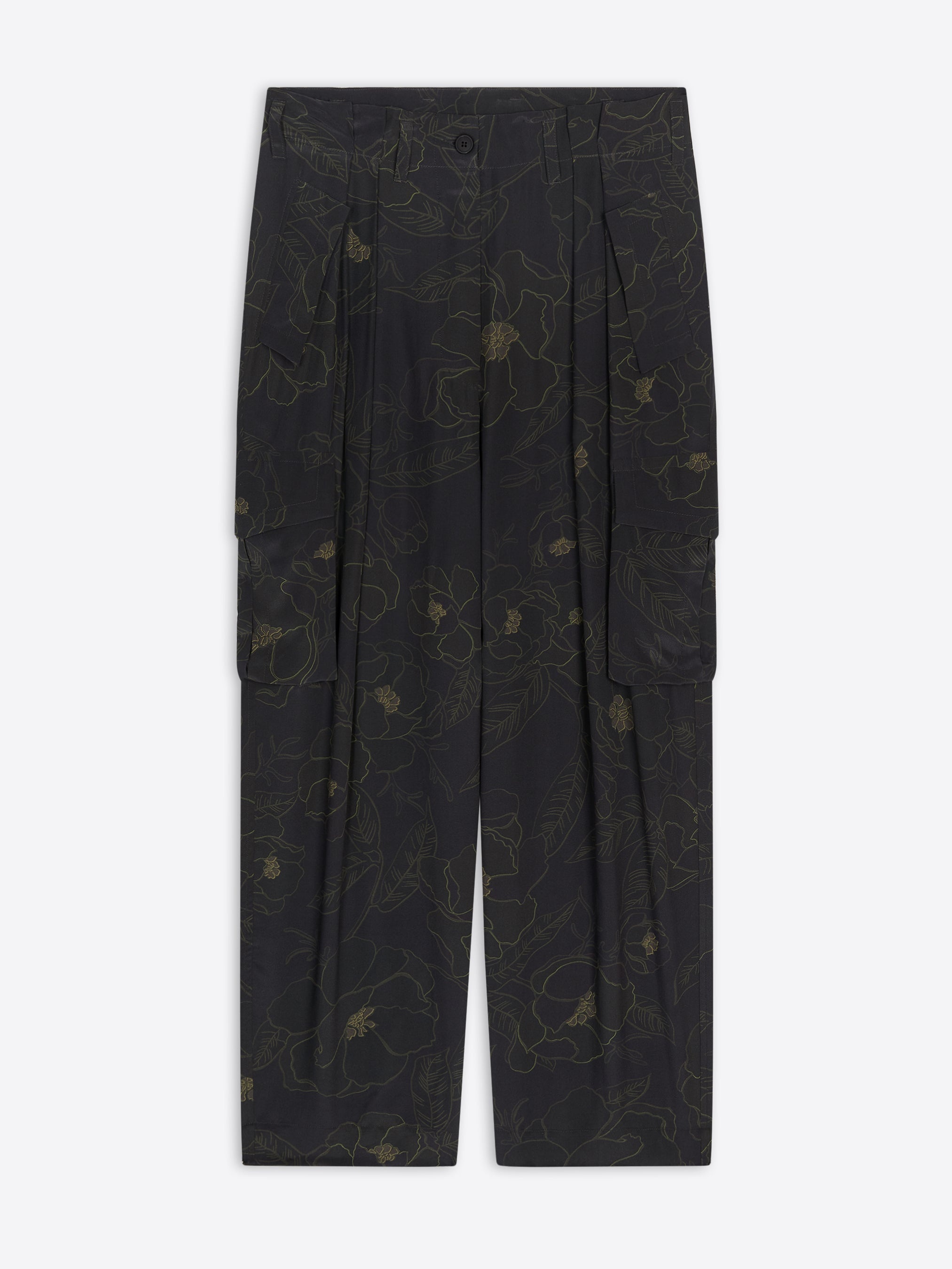 Loose fit workwear pants in silk, with abstract floral print. DETAILS - 100% Silk. - Abstract floral print. - Loose fit. Pleated leg. Side cargo and back patch pockets. Belt loops. Front button and zip closure. - Ref: 242-010910-9068 SIZE AND FIT Model is 179 cm / 70.5 inches and wears size 38.