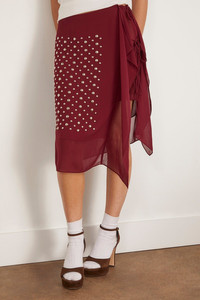The Dries Van Noten Sima Skirt features the unique details you love from this designer. This wrap skirt has embellished silver studs in a lightweight voile material. Wear yours with a shirt and sandals. FIT DESCRIPTION MODEL MEASUREMENTS - Fits true to size, take your normal size - Wrap skirt - Knee length - Silver embellishments - Concealed zipper - 100% Polyester - Charley is wearing a size 34/ 2 US - Bust: 33” - Waist: 25” - Hips: 34” - Height: 5’8”