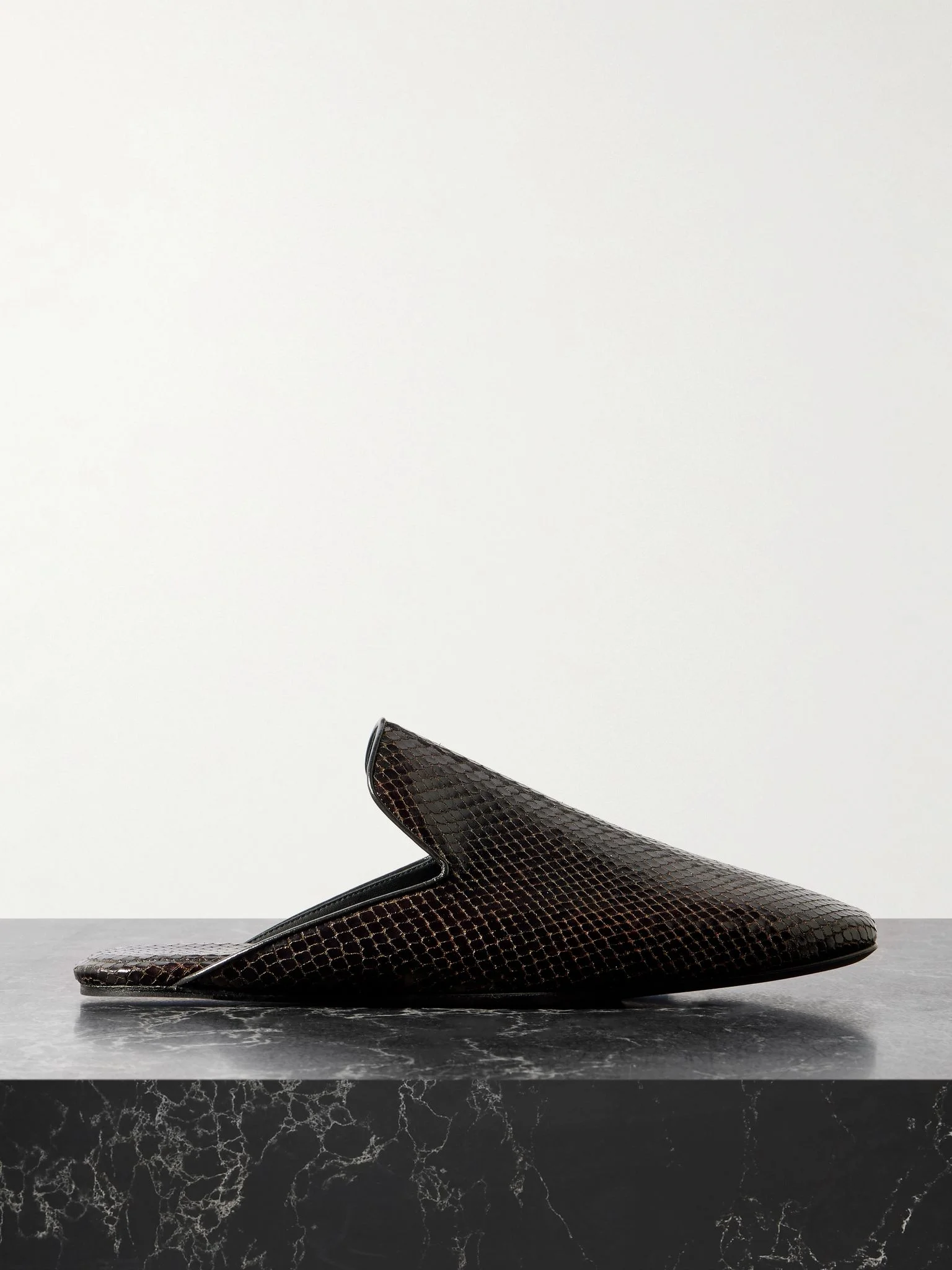 There tend to be so many artistic elements to Dries Van Noten's shoes. These mules are made from snake-effect leather in a sleek and streamlined shape. They have squared-off toes and triangular side cutouts. Size & Fit - Fits true to size, take your normal size - Italian sizing Details & Care - Slight heel - Dark-brown snake-effect leather (Calf) - Slip on