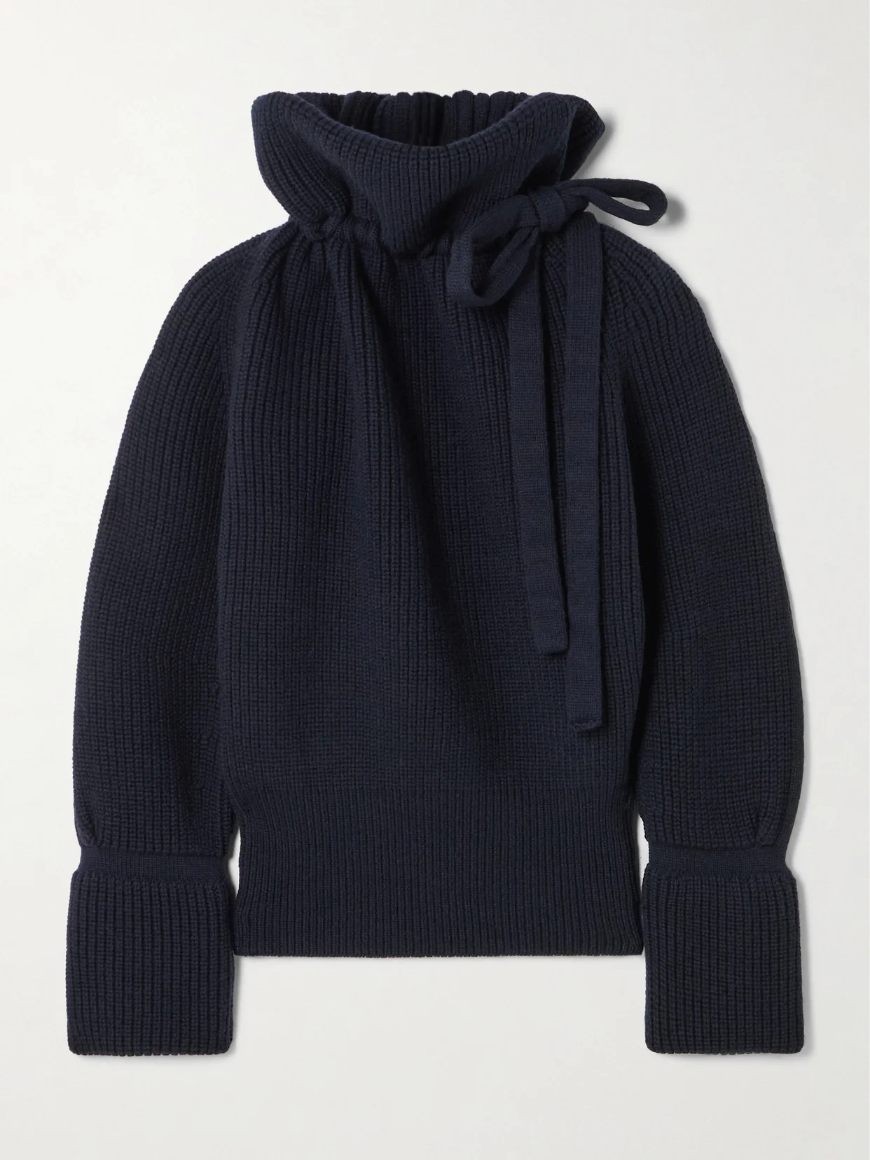 Tie-detailed Ribbed Wool Turtleneck Sweater