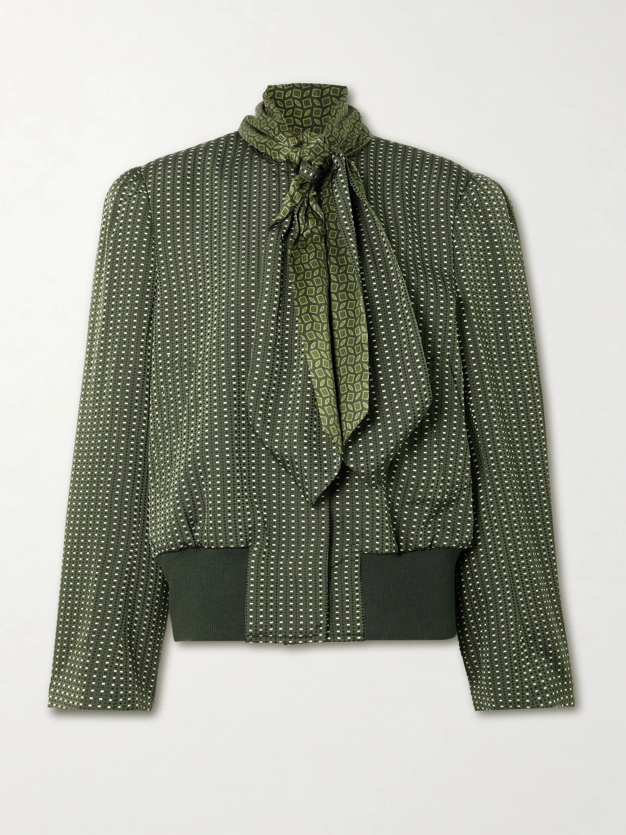 Dries Van Noten's take on the classic bomber jacket feels decidedly feminine. Made from printed twill, it has a satin tie that can be looped into a bow or wrapped around the neck like a scarf.