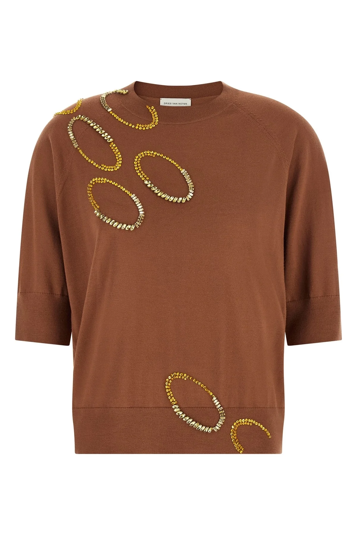cod. 2610112023700700 'Tuan' fine wool sweater, crew neck, embroidery with 'Oversized Ellipses' pattern in sequins and crystals, short sleeves, ribbed trims. Color: Brown Size & Fit: True to size fit Composition: 100% merino wool Made in: China