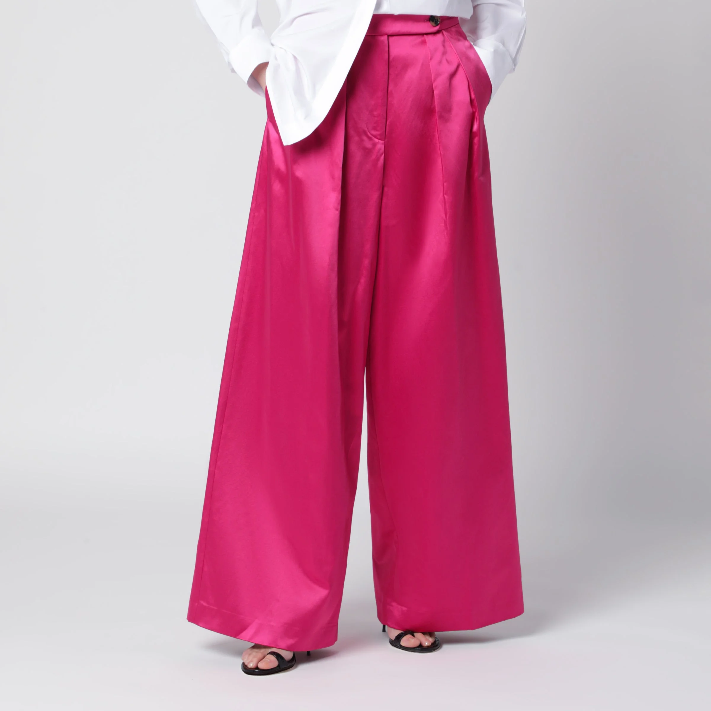 Wide pleated fuchsia satin trousers