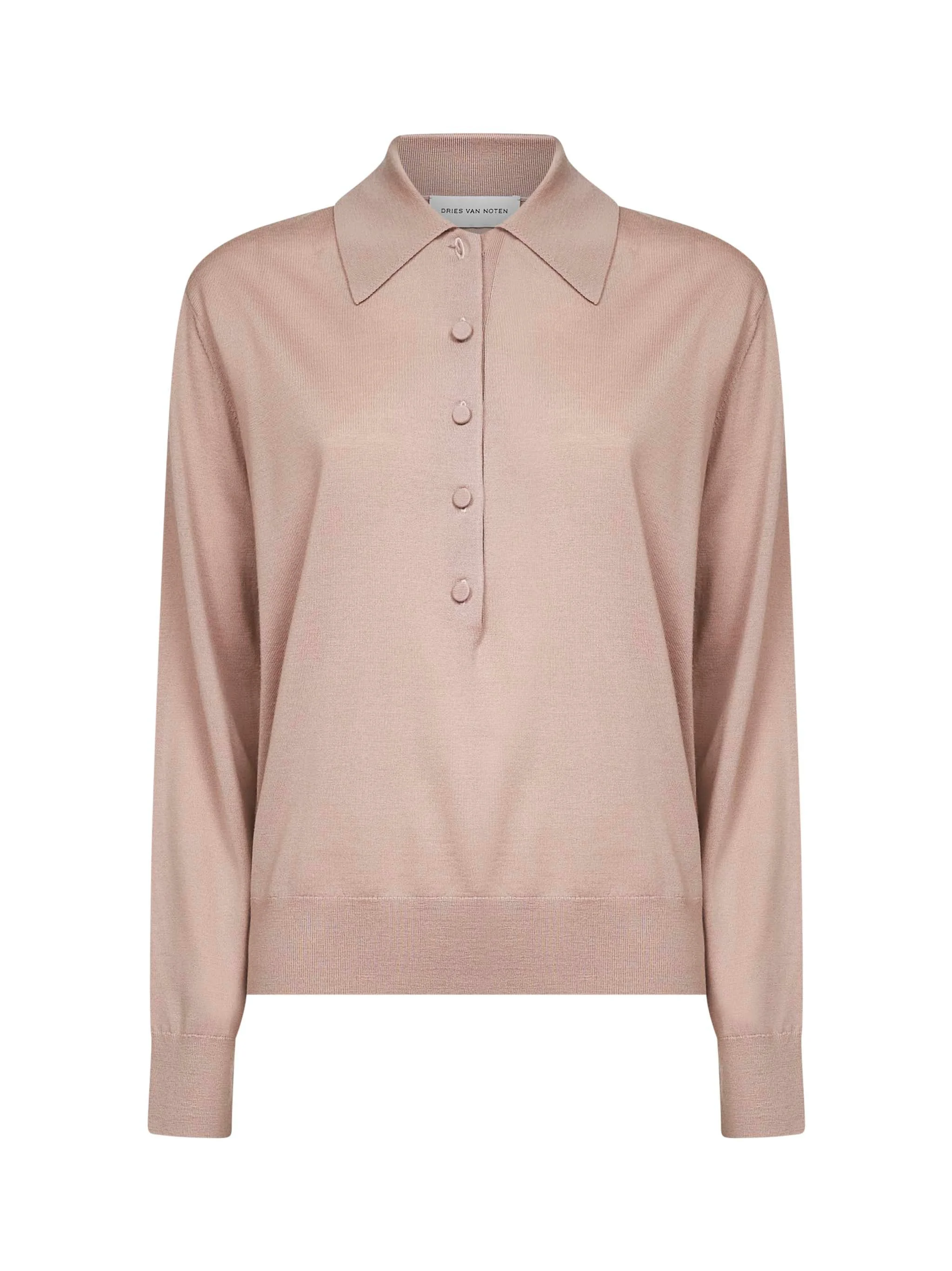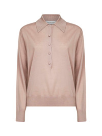 - Long-sleeve wool sweater - Front closure with fabric-covered buttons - Beige color - Polo collar - Made in eu Wool or fine animal hair: Merino100 % Made in: Hong Kong Season: A25 0112032700103