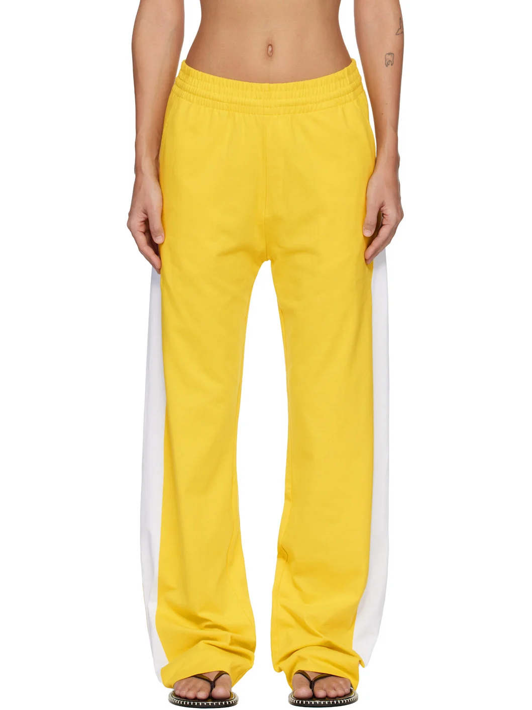 Cotton jersey trousers. · Drawstring at elasticized waistband · Two-pocket styling · Panel stripe at legs extends to back Supplier color: Lemon 100% cotton. Made in Turkey 261358F087016