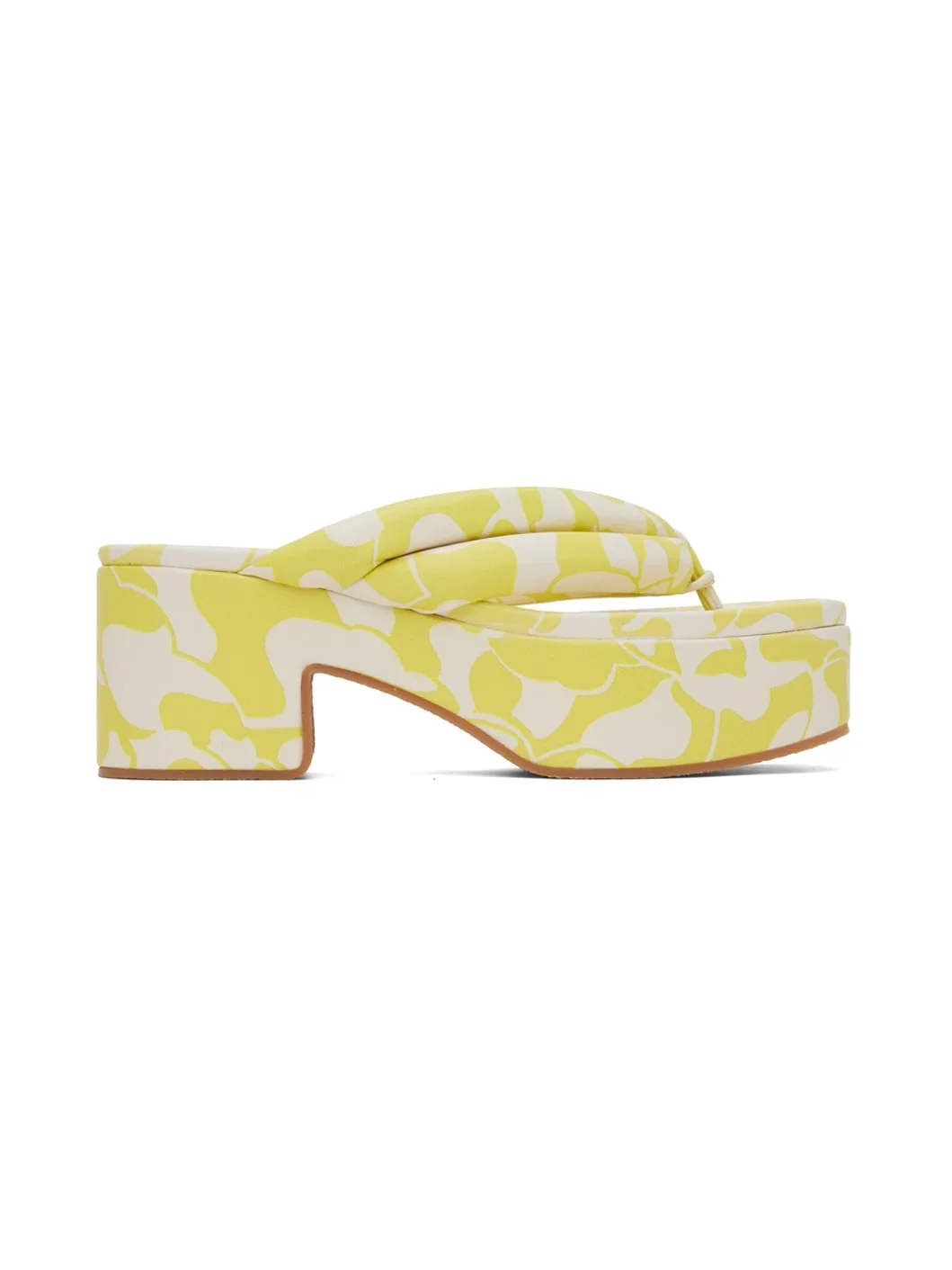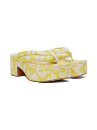 Buffed leather slip-on heeled sandals in yellow. · Graphic pattern printed throughout · Open square toe · Padded thong-style strap at vamp · Logo stamp at padded footbed · Covered block heel · Covered platform midsole · Crepe rubber sole · Platform: H1.5" · Heel: H2.75" Supplier color: Yellow Upper: leather. Sole: rubber. Made in Italy 241358F124003