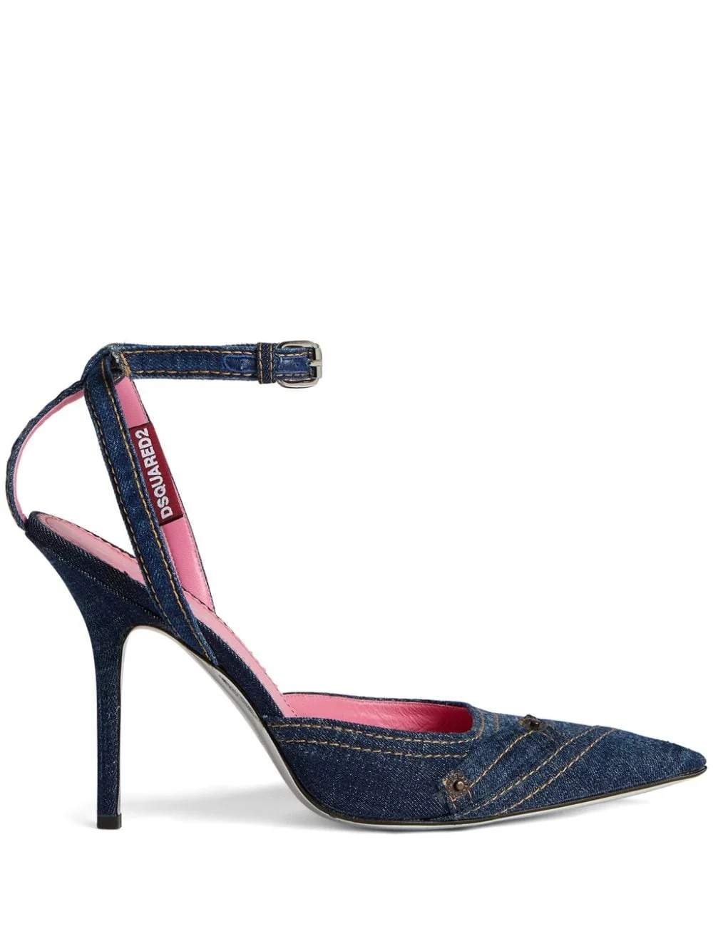 100mm pointed-toe denim pumps Highlights - Indigo blue - Denim - Contrast stitching - Mini logo tag - Pointed toe - Buckle-fastening ankle strap - Branded leather insole - 100mm stiletto heel - Leather sole Made in Italy Composition Cotton 100%