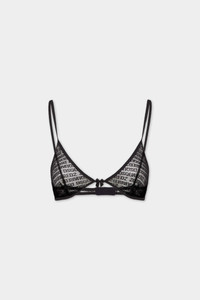 - MADE FROM SHEER NYLON - ALL-OVER DSQUARED2 LETTERING - FRONT BOW DETAIL - ADJUSTABLE CLIP CLOSURE 93% POLYAMIDE, 7% ELASTANE Special occasions call for special underwear. This barely-there triangle bra is made from sheer skin-bearing nylon, embellished with all-over Dsquared2 lettering. Finished with a delicate bow detail.